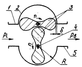 Насос использует два встречно-вращающихся ротора, выполненных в форме восьмерок . Принцип работы насоса (рис. 25) основан на том, что роторы 3 при вращении захватывают карманом, образованным боковой поверхностью ротора и статора, порцию откачиваемого газа из области, находящейся у впускного патрубка, и переносят его в область выхлопного патрубка. Обязательным требованием к конструкции роторов является чрезвычайно высокая точность их изготовления. При их встречном вращении величина зазора δ между поверхностями роторов не должна превышать 0,05 мм, при этом касание роторов недопустимо, т.к. приводит к их разогреву и заклиниванию. Увеличение зазора δ приводит к увеличению обратного потока газа и к снижению эффективности работы.