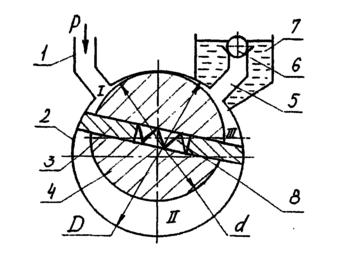 Насос состоит из стального ротора 4, закрепленного эксцентрично внутри стального корпуса 2. Две пластины 3 скользят внутри ротора 4 и плотно прижимаются к внутренним стенкам корпуса 2 с помощью пружины 8 или центробежной силой. При вращении ротора с пластинами откачиваемый газ по впускному патрубку 1 входит в область всасывания I, которая расширяется. Затем газ захватывается следующей пластиной, образуя область переноса II, переносится к впускному патрубку 5, образуя область сжатия, где сжимается до атмосферного давления и выбрасывается из насоса через клапан 6.