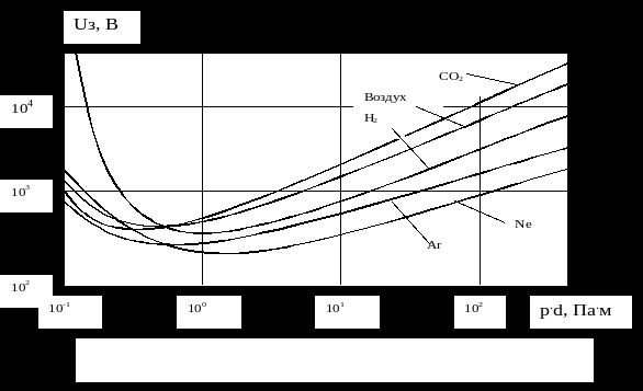 Столб разряда представляет собой плазму, в которой потенциал электронов и положительно заряженных ионов равны, а падение напряжения мало. Газ интенсивно светится в результате излучения энергии атомами при переходе электронов с высоких энергетических уровней на стационарные. В анодной области наблюдается небольшое падение потенциала. Напряжение зажигания тлеющего разряда зависит от рода газа и произведения давления на расстояние между электродами. Эта зависимость иллюстрируется кривыми Пашена (Рис.13).