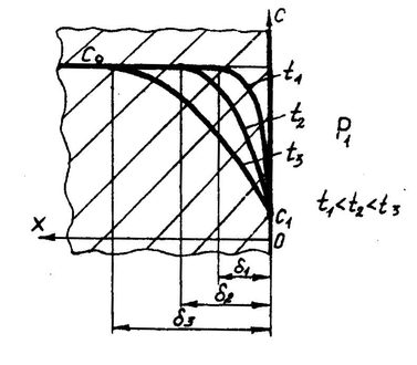 При обезгаживающем прогреве материала наблюдается десорбция газа как с поверхности, так и из приповерхностного слоя твердого тела. При газовыделении из толщи материала происходит нестационарный процесс диффузии, при котором объемная концентрация газа С в каждой точке твердого тела меняется во времени. Характер изменения объемной концентрации С и толщины обезгаженного слоя в приповерхностном слое материала показан на рис.15. Удельный поток газовыделения q из приповерхностного слоя, обусловленный диффузией растворенного газа, определяется выражением: