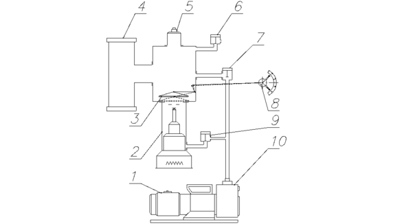 – электродвигатель вакуумного насоса; 2 – насос диффузионный; 3 – затвор высоковакуумный; 4 - камера рабочая; 5 – преобразователь давления инверсионно-магнетронный; 6 - натекатель для напуска рабочего газа; 7 – вентиль; 8 – рукоятка управления; 9 - вентиль; 10 - насос механический пластинчато-роторный