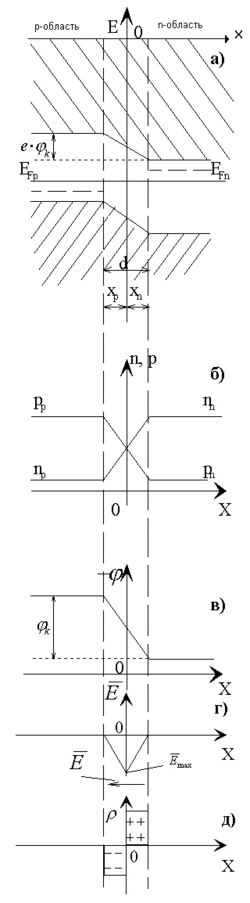 В процессе диффузии электроны перемещаются в p - область и рекомбинируют с дырками, образуя нескомпенсированный отрицательный объемный заряд (рис. д), а дырки перемещаются в n-область, рекомбинируют с электронами и образуют нескомпенсированный положительный объемный заряд (рис. д). Этот двойной слой электрических объемных зарядов создает вблизи границы электрическое поле напряженностью