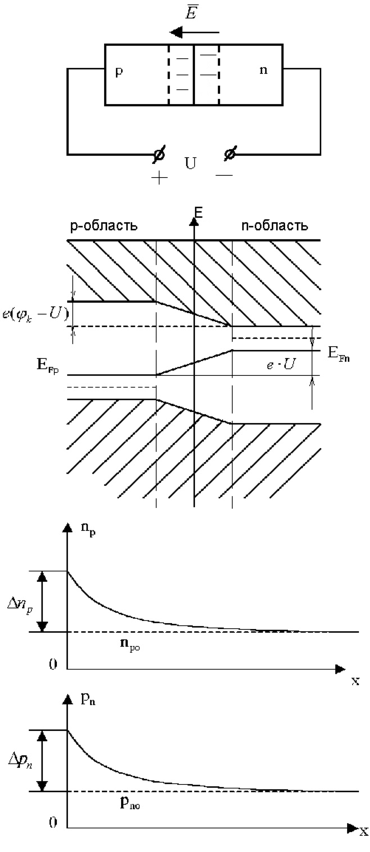 Диффузионное движение частиц через p-n - переход при подключении прямого напряжения U, когда частицы становятся неосновными носителями заряда, как уже было отмечено, называется инжекцией неосновных носителей заряда. При этом концентрации неосновных носителей возрастают с увеличением U: