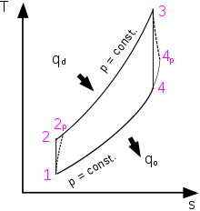 С учётом отличий реальных адиабатических процессов расширения и сжатия от изоэнтропических, строится реальный цикл Брайтона (1—2p—3—4p—1 на T-S диаграмме)
