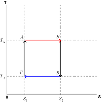 Цикл Карно состоит из четырёх обратимых стадий, две из которых осуществляются при постоянной температуре (изотермически), а две — при постоянной энтропии (адиабатически). Поэтому цикл Карно удобно представить в координатах T (температура) и S (энтропия).