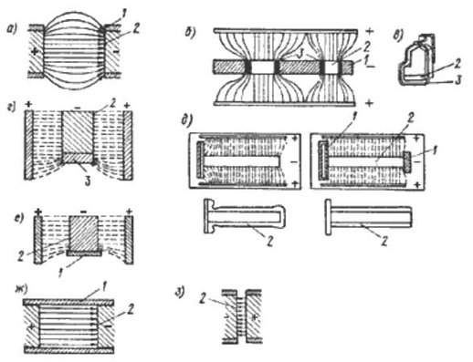 а - схема краевого эффекта; б – защитные катоды при местном хромирован валаб в – проволочный защитный катод у края фасонной детали; г – защитный катод у нижнего края цилиндра ( верхний край под уровнем электролита); д – схема экранирования вала от влияния фланца и краевого эффекта; ж – изоляция межэлектродного объема от остального электролита; з – снижение краевого эффекта при уменьшении межэлектродного расстояния.
