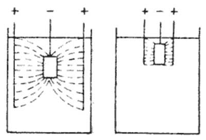 Можно значительно улучшит распределение тока, если верхний край детали расположить непосредственно под уровнем элетролит (устраняется отвлечение тока через верхний объем электролита), а нижний край анода, поднять выше нижнего края детали( увеличится сопротивление тока, отвлекаемому в нижний объем электролита.