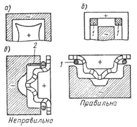 Для равномерного осаждения хрома на внутренних гранях и в углах детали анод должен иметь оттянутые углы( а). При хромировании внешней поверхности для предупреждения грубых «пригорелых» осадков хрома на углах детали аноду придают форму хромируемой детал ( б), а напротив её углов устанавливают непроводящие ток экраны.