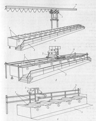 В конструкцию автоматической автооператорной линии входят следующие основные части: металлическая рама, от 11 до 14 ванн, 1—2 автооператора (манипулятора), сушильная камера, загру-зочно-разгрузочное устройство, система вентиляции, система трубопроводов, командоаппарат (система программного управления), вспомогательное оборудование (емкость для приготовления электролитов, фильтровальная установка, насосы, теплообменники и площадка обслуживания).