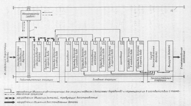 Автоматические автооператорные линии оснащаются приборами контроля, управления и регулирования процессов осаждения металлов, управления источниками тока, выпрямителями и др. Решение этих задач осуществляется с помощью управляющих ЭВМ. Различают линии с автооператорами подвесными, портальными и консольными. Варианты конструкций автоматических автооператорных линий показаны на рисунке.