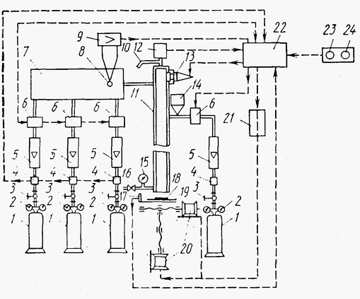 Рис.1. Схема установки для детонационного покрытия: 1 - баллоны с газом; 2 - редукторы; 3 - вентили; 4 - стабилизаторы давления; 5 - ротаметры; 6 - электромагнитные клапаны; 7 - смесительное устройство; 8 - термопары; 9 - усилитель; 10 -патрубок для слива воды; 11 - ствол; 12 - реле давления; 13 - свеча для инициирования взрыва; 14 - дозатор; 15 - манометр; 16 - вентиль для подачи воды; 17 - датчик, фиксирующий взрыв и выдающий команду на выполнение следующего взрыва; 18 - покрытие; 19 - напыляемая деталь; 20 - электродвигатель с приспособлениями, перемещающими деталь; 21 - управляемое устройство для перемещения детали; 22 - шкаф для электрического управления; 23 - кнопка «Пуск» установки; 24 - кнопка «Стоп» установки.