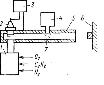Отличительная особенность детонационного напыления - циклический характер подачи порошка на поверхность обрабатываемой детали со скоростью, превышающей скорость звука. Циклический процесс напыления получают с помощью детонационных установок, принципиальная схема которых представлена на рис. 2.