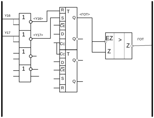 триггера, из-за чего на выходе триггера появится уровень логического нуля, который будет подан одновременно на информационный вход и вход разрешения вывода информации буферного элемента с 3-мя состояниями, из-за чего на выходе буферного элемента появится уровень логической единицы, и, следовательно, на выходную шину будет выдан сигнал ГОТ=1.