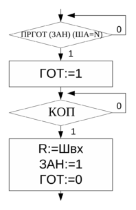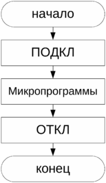 Микропрограмма подключения опрашивает шины адреса и шину управления ПРГОТ. При этом вычисляется значение выражения ПРГОТ (ЗАН) (ША=N), где ПРГОТ – сигнал выставляемый внешним устройством на шину управления, ЗАН – сигнал занятости вычислительного устройства, ША=N – условие совпадения адреса, передаваемого внешним устройством на адресные шины и адреса вычислительного устройства. Если выражение принимает значение равное 1, то осуществляется подключение путем формирования сигнала готовности (для этого предусмотрена микрооперация ГОТ=1), который указывает инициирующему устройству о готовности к работе. Далее выполнение микропрограммы приостанавливается до получения сигнала КОП=1, передаваемого внешним устройством по шине управления. Как только сигнал КОП=1 получен, производится считывание команды с входной шины данных, формируется сигнал ГОТ=0 и устанавливается сигнал ЗАН=1. На этом микропрограмма подключения заканчивает свою работу.