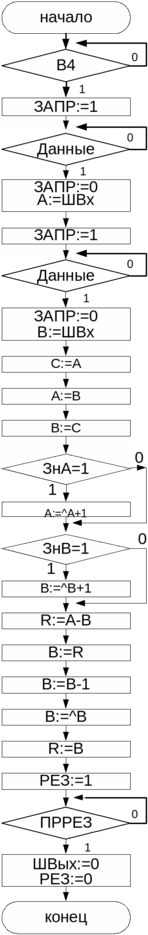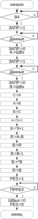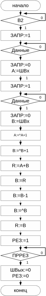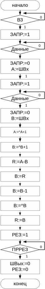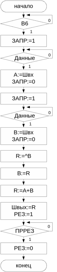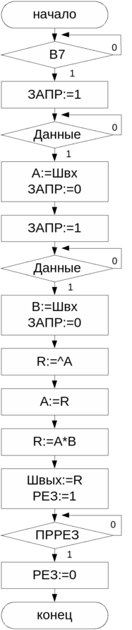 Считывание слова данных реализовано следующим образом. Микропрограмма операции генерирует сигнал запроса (для этого предусмотрена микрооперация ЗАПР=1), который осведомляет внешнее устройство о готовности вычислительного устройства к приему данных. В ответ внешнее устройство передает слово данных на входную шину данных, генерируя при этом сигнал ДАННЫЕ=1. Пока сигнал ДАННЫЕ не поступит на управляющую шину, выполнение микрооперации приостанавливается, как только сигнал будет получен, вычислительное устройство производит считывание слова данных, при этом снимается сигнал запроса данных (для этого предусмотрена микрооперация ЗАПР=0).В ответ внешнее устройство устанавливает сигнал ДАННЫЕ=0. Если для выполнения операции необходимо два операнда, то для считывания второго слова данных процедура считывания повторяется.