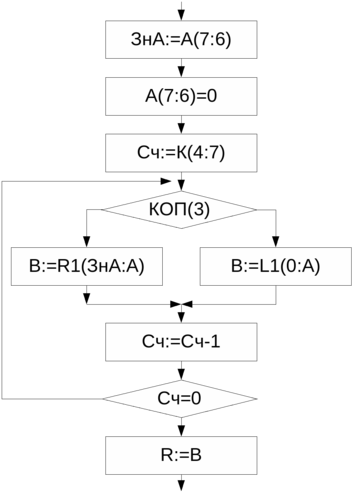 Вначале осуществляется подключение устройства к шине. Затем считывается код микрооперации на, основании одного из логических условий B1-B7, принимается решение о том, какая микрооперация должна быть выполнена. Условия формируются следующим образом: