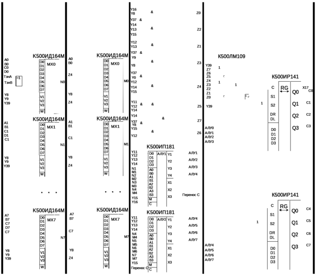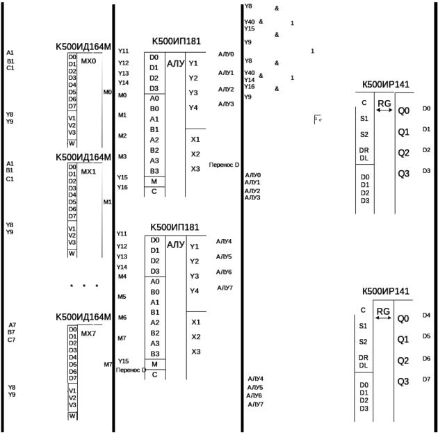 8-ми мультиплексоров МС K500 ИД164 для выбора первого операнда, который с шины будет поступать в АЛУ- это либо D , либо А, второй операнд фиксирован-это В. Выбор осуществляется на основе управляющих сигналов.