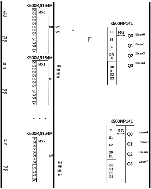 К каждому регистру на данной схеме подводится набор, управляющих сигналов, которые определяют режим его работы: хранение, запись, сдвиг вправо, сдвиг влево – необязательно все эти режимы.