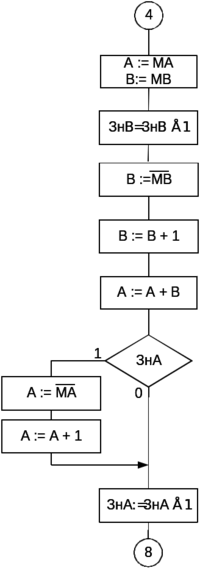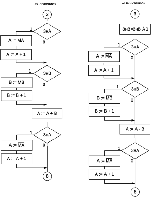 , в случае если оно отрицательно. Далее операнды подаются в схему АЛУ и результат сложения заносится в регистр А. Над ним производится та же процедура проверки и перевода обратно в прямой код. Графы операций сложения и вычитания показаны на рисунке 4.