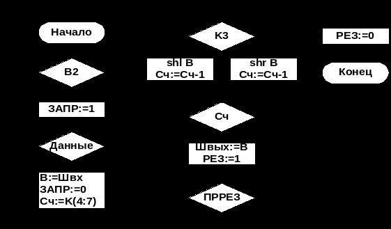 Циклический сдвиг – это такой сдвиг, при котором не сохраняется знак числа. Сам сдвиг будем осуществлять в регистре B. В зависимости от значения бита знака K(3) в поле кода операции, содержимое регистра B будет сдвигаться вправо или влево на число позиций, записанное в поле K(4:7).