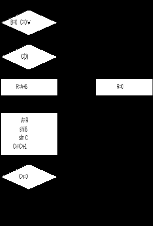 лгоритм выполнения операции умножения приведен на рис. 1. Если один из множителей равен 0, то результату присваивается значение 0, и умножение не производится. Регистр А используется для накопления результата умножения; его начальное значение 0. В регистр С помещается первый множитель, а в регистр В второй. Регистр R принимает результат операции из АЛУ и из него выдается результат умножения.