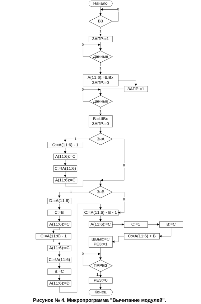 Алгоритм микропрограммы операции "вычитание модулей" представлен на рисунке № 4.