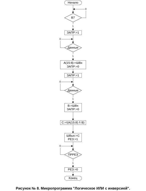 Если при вычислении логического условия ЗнВ в ходе выполнения операции "деление" или "вычитание модулей" получилось, что ЗнВ=1, то вызывается специально выделенная процедура инвертирования знака числа В. В самом конце своей работы данная процедура вычисляет логическое условие В1, и если В1=1, то переходит к микрооперации увеличения счетчика в операции "деление"; если В1=0, то процедура переходит к следующей микрооперации (после той, из которой вызвали процедуру) в операции "вычитание модулей" или "вычитание модулей обратное".