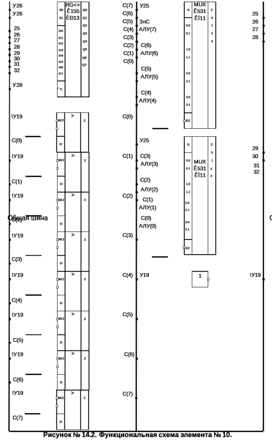 Сигнал У19 всегда инвертируется и подается на вход управления третьим состоянием у буферных элементов. Только при У19=1 разрешается запись из регистра С в выходную шину.