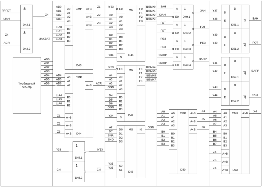 Данный операционный элемент вырабатывает сигнал ЗАХВАТ, управляет работой сигналов ЗАН, ГОТ, РЕЗ и ЗАПР. Так же он содержит мультиплексоры с третьим состоянием для выбора значений, выводимых на шину. На шину могут выводится только регистры А и D. В сотав элемента входит мультиплексор для выбора выводимого на шину старшего разряда. Им могут быть знаковые триггеры A и D или 7 разряды регистров A и D. Также операционный элемент отвечает за выдачу на шину регистров A или D при помощи мультиплексоров D46,D47