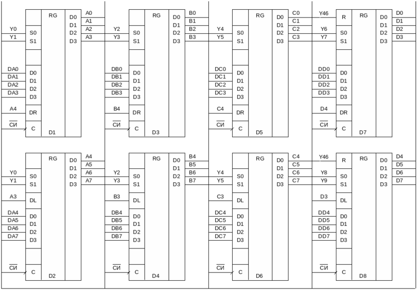 Элемент представляет собой регисторный блок. Каждый из четырех регистров построен на базе двух регистров.