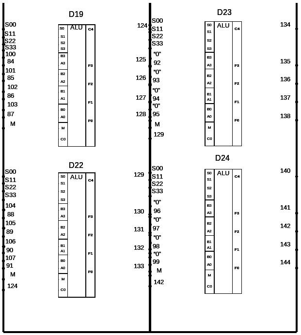 - АЛУ, состоящего из четырех одинаковых микросхем АЛУ, и предназначенного для выполнения всех арифметических и логических операций, использующихся в обобщенной микропрограмме (кроме операций со счетчиком);