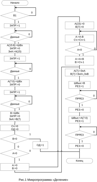 Для хранения знака делимого и делителя (А и С) (в случае выполнения микрооперации деления) используются триггеры, обозначенный соответственно как ТрЗн1 и ТрЗн2.