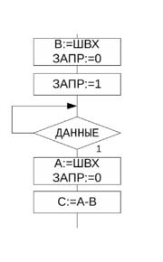 Считывание слова данных реализовано следующим образом. Микропрограмма операции генерирует сигнал запроса (для этого предусмотрена микрооперация ЗАПР=1), который осведомляет внешнее устройство о готовности вычислительного устройства к приему данных. В ответ внешнее устройство передает слово данных на входную шину данных, генерируя при этом сигнал ДАННЫЕ=1. Пока сигнал ДАННЫЕ не поступит на управляющую шину, выполнение микрооперации приостанавливается, как только сигнал будет получен, вычислительное устройство производит считывание слова данных, при этом снимается сигнал запроса данных (для этого предусмотрена микрооперация ЗАПР=0).В ответ внешнее устройство устанавливает сигнал ДАННЫЕ=0. Если для выполнения операции необходимо два операнда, то для считывания второго слова данных процедура считывания повторяется.