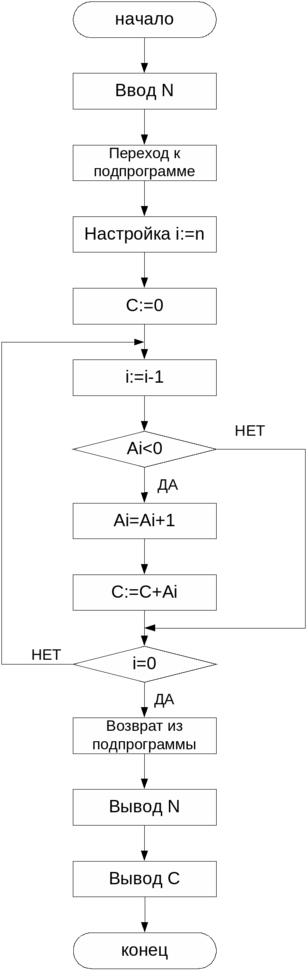 Разработать центральное устройство управления специализированного процессора, предназначенного для выполнения операции: в массиве А все отрицательные элементы преобразовать в дополнительный код и найти их сумму. N=16- размерность массива, n<17 – задается командой ввода, А – массив размерностью по 16 однобайтовых слов. С – переменная, в которую записывается результат сложения. Вывести A , n u C результаты на экран дисплея.
