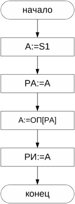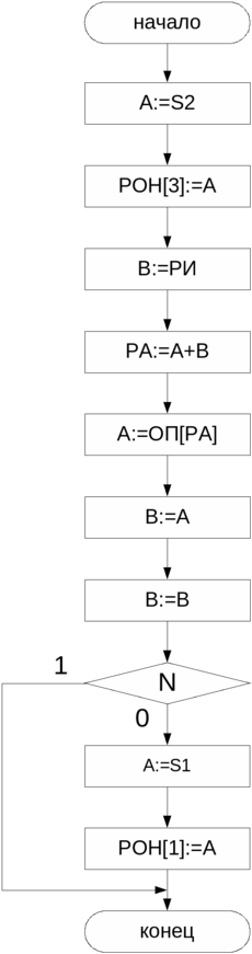 е) «Переход условный по индексному значению» (ПУ2) – команда анализирует содержимое индексного регистра. Если оно равно нулю, то осуществляется переход к следующей команде, а не равно нулю, то выполняется переход к команде, адрес которой указан в поле S1 команды ПУ2. В микропрограмме необходимо проанализировать значение индексного регистра на нуль, но признак нуля – Z (как и все остальные признаки N, C, P) вырабатываются только в АЛУ, поэтому необходимо значение индексного регистра пропустить через АЛУ. Для этого используются две микрооперации В:=РИ и В:=В.
