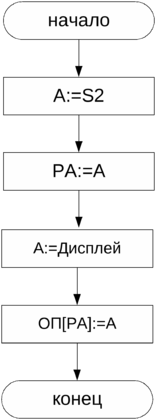 а) «Ввод» (Вв) – по этой команде байт данных в шестнадцатеричной системе счисления заносится с экрана дисплея в ячейку оперативной памяти по адресу, записанному в поле S2. Микропрограмма этой операции приведена на рисунке: