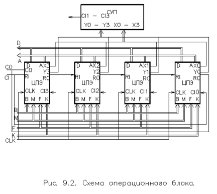 В микроЭВМ реализовано УУ с микропрограммной реализацией команд. При этом каждая команда представляется как последовательность микрокоманд. Микрокоманды выполняются с частотой поступления синхросигналов CLK. В процессе исполнения микрокоманды ОБ выполняет одну из предусмотренных его схемотехнической реализацией операций с содержимым внутренних регистров или внешних магистралей А, D, М, В в соответствии с кодом микроинструкций F, К, CI. В результате выполнения микрокоманды формируются сигналы переноса СО, ОБ, выходные коды А иВ и преобразуется содержимое внутренних регистров.