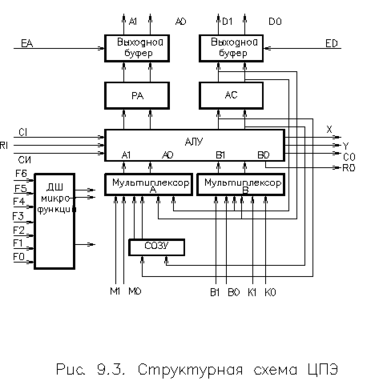 Схема центрального процессорного элемента. Центральный процессорный элемент (рис. 9.3) выполняет арифметические, логические и регистровые функции 2-разрядного микропрограммного ОБ. Данные от внешних устройств поступают в ЦПЭ по шине В, данные из ОЗУ — по шине М. Выходные данные от ЦПЭ во внешние устройства передаются по шине D, а адрес внешнего устройства или ячейки ОЗУ определяется шиной А. Внутри ЦПЭ данные хранятся в одном из 11 регистров СОЗУ или в АС. Данные от входных шин, регистров СОЗУ .или АС поступают на входы АЛУ через два внутренних мультиплексора А и В. Дополнительные входы и выходы переноса и сдвига вправо служат для организации переносов и сдвигов.