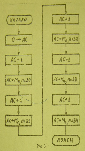 Загрузить последовательно все команды программы, используя режим WI. Пример рабочей программы представлен в табл. 3, а ее алгоритм - на рис. 6. Данная программа производит последовательное увеличение содержимого АС, т.е. выполняется операция AC + I → AC.