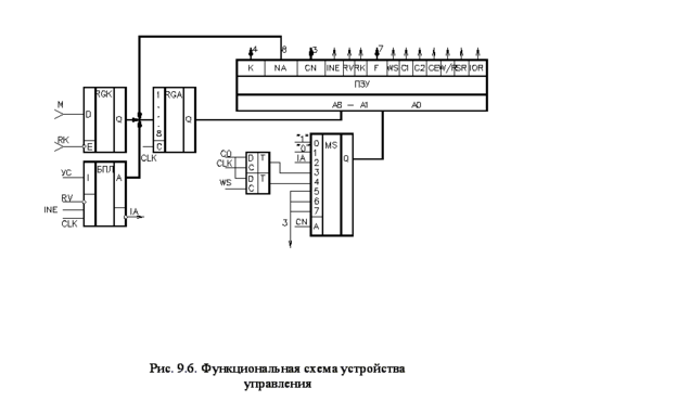 Устройство управления. В работе [30] подробно рассмотрена работа микроЭВМ, использующей микросхему БМУ К589ИК01, и указаны недостатки таких микроЭВМ. Устройство управления (УУ) микроЭВМ может быть реализовано на регистрах с динамическим управлением записью, при этом расширяются возможности по выбору адреса следующей микрокоманды. Устройство управления микроЭВМ обеспечивает последовательность выборки команд в соответствии с алгоритмом решаемой задачи, формирует управляющие коды для операционного блока и совокупность управляющих сигналов, обеспечивающих совместную работу блоков при выполнении текущей команды. На рис. 9.6 приведена функциональная схема УУ, реализующего микрокомандный принцип.