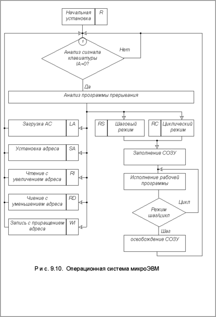 Операционная система микроЭВМ. Структура: операционной системы микроЭВМ приведена па рис. 9.10, (блок 1 — переход в общую системную программу). Работа микроЭВМ начинается с установки значений во всех регистрах ЦПЭ. Вызывается начальная установка нажатием клавиши R (reset) или при первоначальном включении питающего напряжения. В процессе начальной установки обнуляются регистры ЦПЭ AC, RA, PC и программно формируется звуковой сигнал, представляющий собой нарастающий звуковой тон.