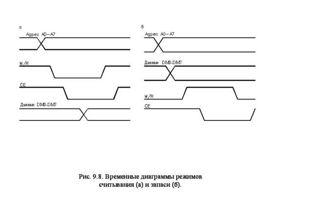 Работа ОЗУ в режиме считывания информации. Для считывания информации из ОЗУ необходимо последовательно выполнить следующие процедуры (рис. 9.8, а): выставить на шину адреса код ячейки ОЗУ, с которой считывается информация; установить в “0” сигналы W/R и СЕ.
