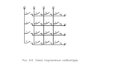 Формирование двоичных ко-з,ов, соответствующих замыканию одной из 16 кнопок, может выполняться микроЭВМ при подключении кнопок в соответствии со схемой рис. 9.9.