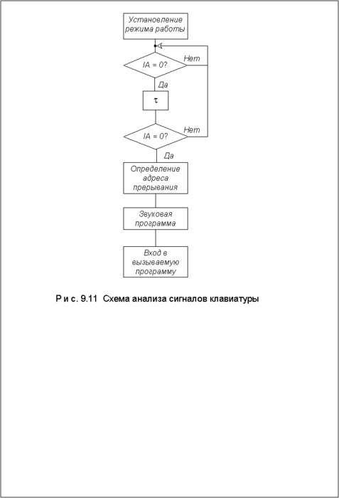 После начальной установки системных регистров микроЭВМ переходит к программе анализа сигналов клавиатуры, задающих режим работы. Схема программы представлена на рис. 9.11. Начинается программа блоком анализа выхода IA БПП, который примет уровень логического нуля при нажатии одной из клавиш, задающих режим. При IА=0 управление передается блоку временной задержки, позволяющему устранить влияние, случайного сигнала на выходе IA. При повторном опросе сигнала IA через время т управление передается первому блоку при исчезновении запроса прерывания (IА=1), а в случае повторного подтверждения сигнале IА=0 формируется код прерывающей программы , на выходах КО — К2 БПП и после подпрограммы формирования звукового сигнала управление передается программе, вызванной нажатой кнопкой.