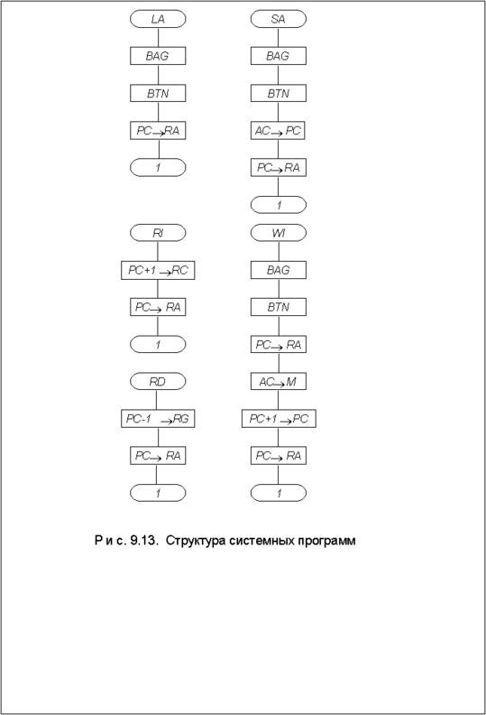 Системная программа LA служит для записи в аккумулятор кода с клавиатуры. Схема программы приведена на рис. 9.13, а. Начинается программа с заполнения стека адресом выхода из подпрограммы BAG и обращением к подпрограмме BTN. Затем подпрограммой BTN записывается в АС код нажатых клавиш и содержимое R8 (программный счетчик PC) записывается в RA. Программа SA обеспечивает запись в PC и RA кода с клавиатуры (рис. 9.13, б).