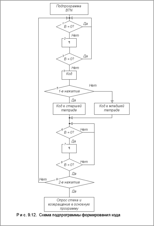 ля устранения случайного сигнала при анализе шины В клавиатура опрашивается повторно через время после появления первого сигнала. Время выбирается большим, чем время переходных процессов сигнала клавиатуры. При подтверждении сигнала на шине В программно формируется четырехразрядный код, соответствующий нажатой клавише. При первом нажатии клавиши код заносится в старшие разряды формируемого слова. Блоки 6—8 фиксируют момент отпускания кнопки с учетом переходных процессов. В блок 7 управление передается после первого момента исчезновения сигнала на шине В и после подтверждения через время исчезновения сигнала на шине. Процедура повторяется для записи младших разрядов слова. Завершается ввод кода после двух нажатий кнопок. Обращение к подпрограмме формирования кодов из системных программ осуществляется через стековую память.