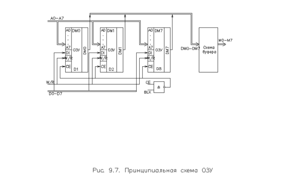 Микросхемы К561РУ2 выполнены по К-МОП-технологии, поэтому для согласования выходов микросхем с ТТЛ-входами в ОБ применены буферные усилители К561ПУ4. На схеме (рис. 9.7) выходы микросхем ОЗУ DMO — DM7 поступают на входы буферных усилителей, а их выходы МО — М7 образуют шину данных из ОЗУ (магистраль М).