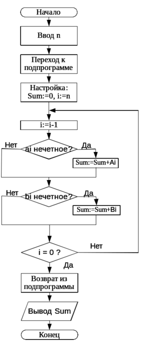 Для выполнения поставленной задачи подсчета полной суммы нечетных элементов двух массивов А и В, воспользуемся следующим алгоритмом: