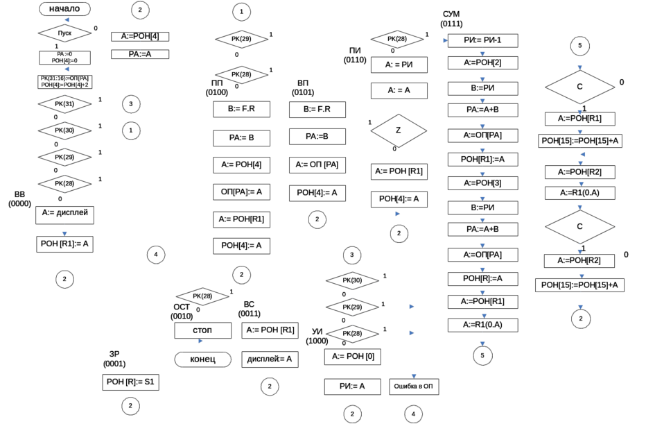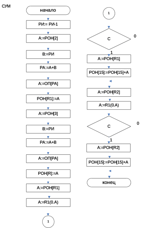 | СУМ | 0111 | “Суммирование” РОН[15]:= РОН[15]+A[i]+B[i] | ||||