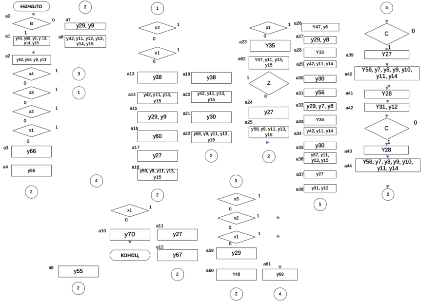 В соответствии с закодированным графом разрабатываем управляющий автомат по схеме Мура и строим списки переходов. Списки переходов содержат всю информацию, необходимую для построения управляющего автомата ЦУУ.